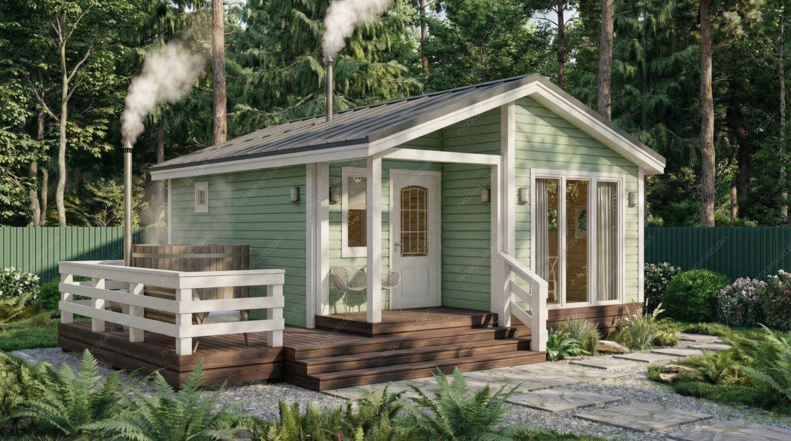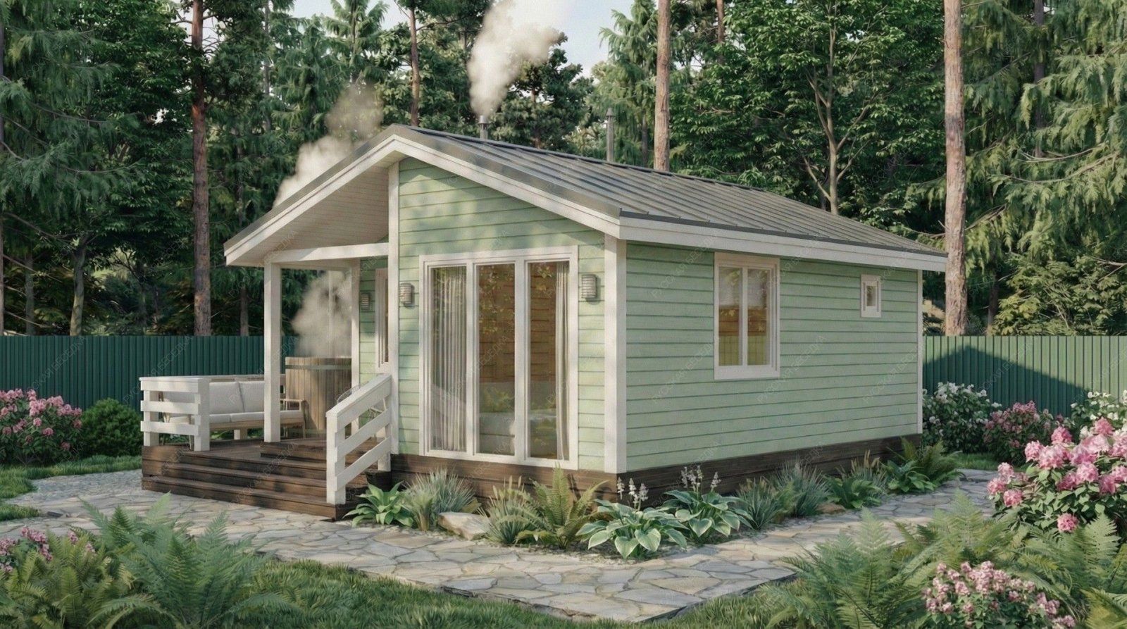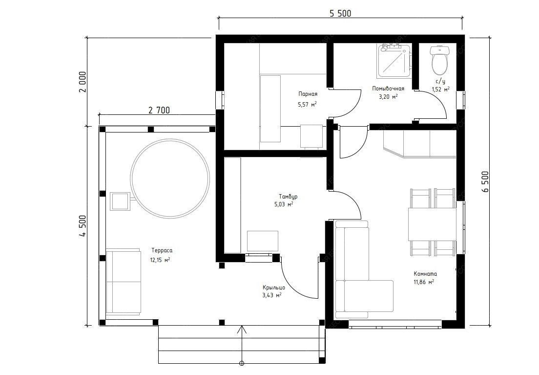Баня «Фиоре» сочетает в себе классическую архитектуру с двускатной крышей и исключительно удобную планировку, где каждая деталь направлена на создание комфортной среды. Просторная открытая терраса площадью 13,28 м² органично дополняет ансамбль, предлагая место для отдыха на природе после банных процедур.  Внутреннее пространство отличается тщательным зонированием. Уютный тамбур и крыльцо создают переходную буферную зону, сохраняя тепло. Основной акцент сделан на комфортном отдыхе: просторная комната (11,86 м²) подходит для приема гостей, а наличие отдельного санузла повышает автономность строения. Функциональная парная (5,57 м²) с окном-форточкой и изолированная помывочная обеспечивают гигиеничность и правильный банный микроклимат.  Надежная двускатная конструкция крыши и качественная древесина гарантируют долговечность постройки и оптимальное теплосбережение. Продуманная компоновка помещений и солидные габариты (5,5х6,5 м) делают баню «Фиоре» готовым решением для создания полноценного оздоровительно-релаксационного комплекса на частном участке.