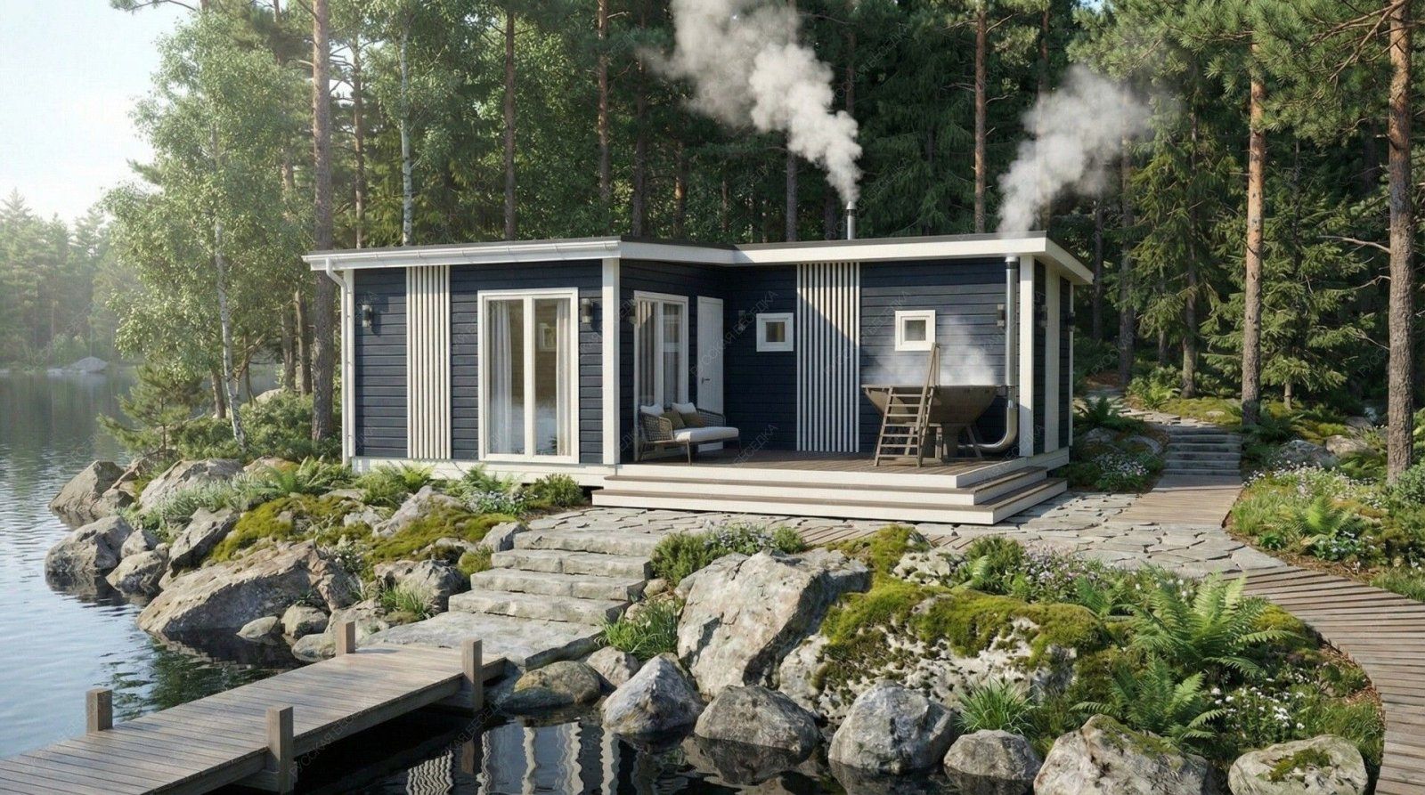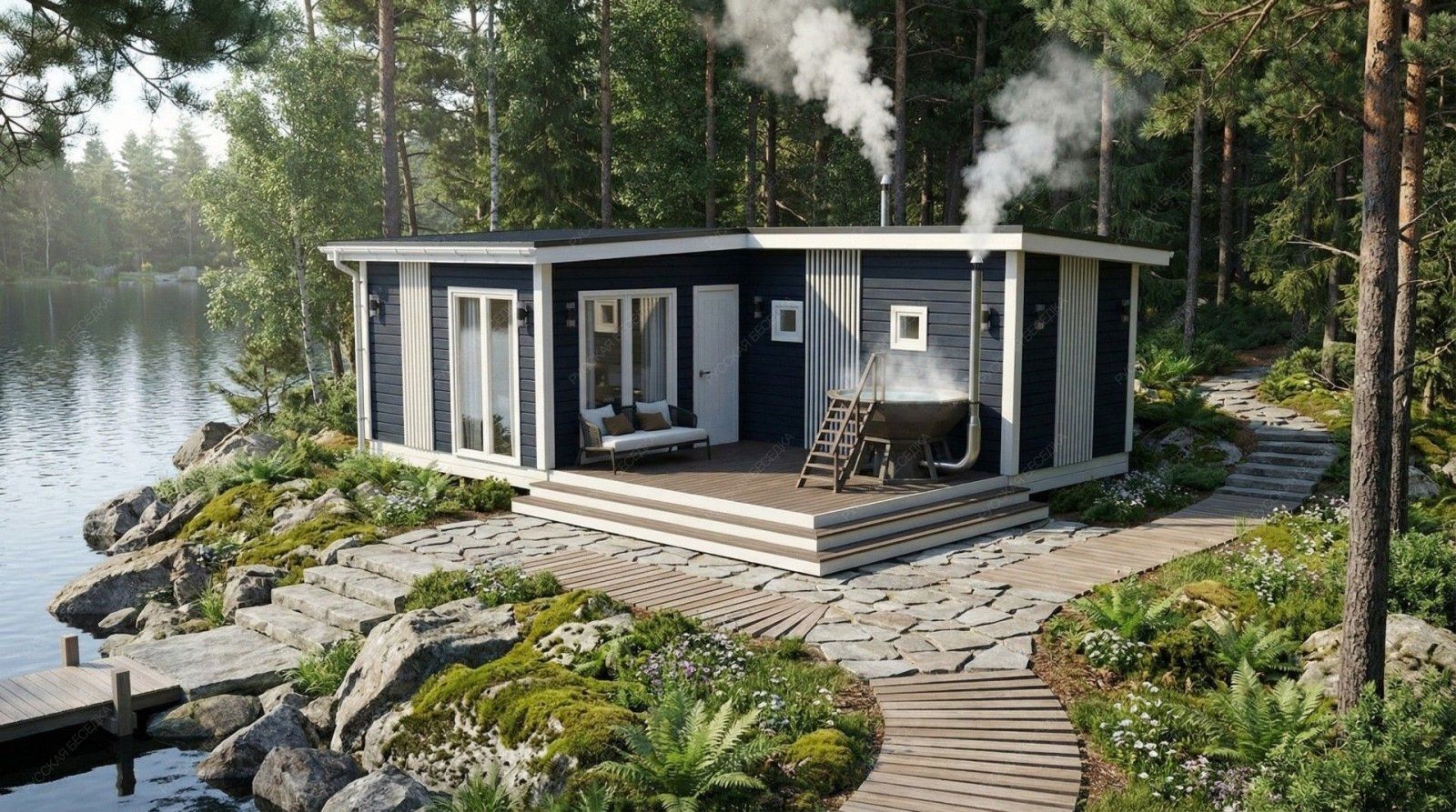 Баня «Монреаль» воплощает концепцию гармоничного пространства, где каждая зона спроектирована для максимального комфорта и расслабления. Обширная открытая терраса площадью 13,28 м² является ключевым элементом архитектуры, плавно продолжая внутреннее пространство и создавая идеальную площадку для отдыха на свежем воздухе, где отлично может расположиться традиционный банный чан для контрастных водных процедур.  Внутренняя планировка отличается продуманной логистикой и комфортом. Просторная комната отдыха (15,9 м²) легко трансформируется в гостиную или столовую, вмещая большую компанию. Функциональная парная (4,83 м²) с деревянным окном-форточкой обеспечивает правильный температурный режим, а отдельная помывочная (3,06 м²) и санузел повышают уровень бытового удобства, делая строение полностью автономным. Односкатная крыша и солидные габариты (5,95х7,5 м) формируют современный, лаконичный экстерьер.  Качественный конструктив из отборной древесины гарантирует долговечность и отличные теплосберегающие свойства. Этот проект предлагает не просто баню, а целый гостевой павильон с акцентом на размеренный отдых и общение, где детали работают на создание завершенной атмосферы загородного релакса.