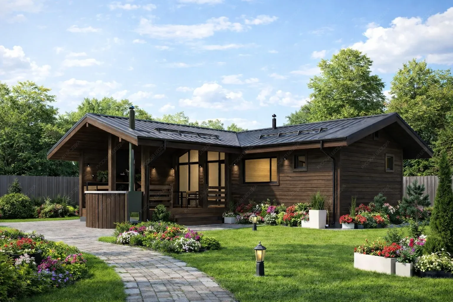 Баня «Жар» с габаритами 10х12 метров представляет собой масштабное одноэтажное строение площадью 120 кв.м. под классической двухскатной крышей. Архитектурной доминантой проекта является просторная терраса, интегрированная с основным пространством через панорамные окна зоны отдыха. Это решение создает эффект расширения внутреннего объема и обеспечивает плавный переход от интерьера к окружающей природе, наполняя помещение светом. Внутренняя планировка такой площади позволяет реализовать любое функциональное зонирование: от вместительной парной и душевой до дополнительных помещений вроде бильярдной или кухни-гостиной. Каркасная технология возведения остается оптимальной для объектов такого размера, обеспечивая контролируемые сроки строительства и высокие показатели энергосбережения при условии профессионального утепления. Конструкция двухскатной крыши надежна и практична для схода осадков. Данная модель подходит для создания полноценного банного комплекса, где можно не только проводить оздоровительные процедуры, но и организовывать продолжительный отдых большой компании в единении с ландшафтом.