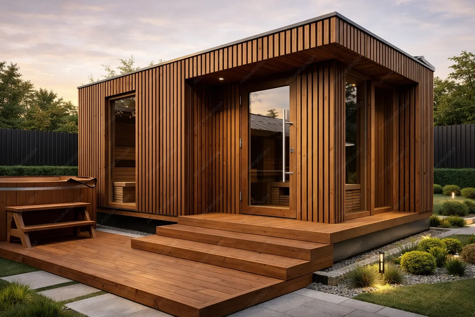 Мобильная баня «Октала» с габаритами 4х7 метров и односкатной крышей предлагает современное архитектурное решение площадью 28 кв.м. Её ключевая особенность — открытая терраса, конструкция которой предусматривает стационарную установку купели. Это создает цельный спа-комплекс, где процедура парения логически завершается контрастным погружением на свежем воздухе, обеспечивая полноценный цикл релаксации. Внутренняя планировка отличается рациональностью: компактная парная, функциональная душевая, санузел и просторная комната отдыха формируют все необходимое для комфортного пребывания. Гладкие линии, односкатная кровля и лаконичное оформление подчеркивают современный дизайн проекта. Мобильность конструкции обеспечивает быстрый монтаж на подготовленной площадке без капитальных работ. Данная модель является оптимальным решением для ценителей современной эстетики, технологичности и комплексного подхода к оздоровительному отдыху, где внутренний комфорт органично дополняется уникальной возможностью уличной купели.