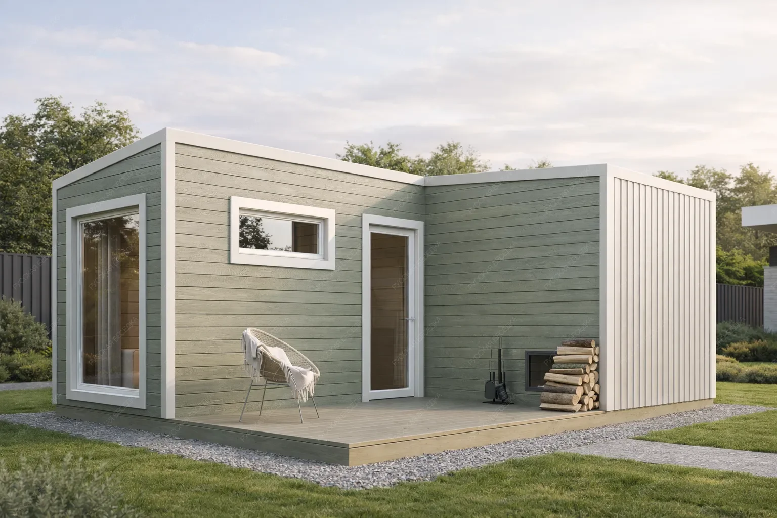 Баня «Папоротник» предлагает нетривиальное архитектурное решение с угловой формой и односкатной крышей, создающей современный динамичный силуэт. Каркасная конструкция размером 6х5 метров эффективно использует площадь 30 кв.м., объединяя под одной кровлей функциональные помещения и открытую террасу. Ключевыми особенностями являются топка печи с улицы, обеспечивающая безопасность и чистоту внутри, а также панорамное окно в комнате отдыха, наполняющее интерьер светом и создающее визуальную связь с природой. Угловая планировка позволяет рационально зонировать внутреннее пространство, органично вписав строение в ландшафт участка. Открытая терраса служит естественным продолжением зоны отдыха. Каркасная технология гарантирует быстрый монтаж и высокие теплоизоляционные свойства. Данный проект идеально подходит для ценителей современной эстетики, практичности и нестандартных решений, желающих получить не просто парную, а многофункциональное пространство для релаксации с акцентом на единение с окружающей средой.