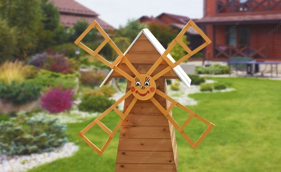 Забавная мельница из дерева с личиком может стать достоянием детского садика и любимым местом игр детворы. Такое изделие вызывает улыбку, оно создает атмосферу сказочного волшебства, где каждый предмет будто по-настоящему живой. Мельница не большая по высоте, ее лопасти подвижны. Рядом с ней можно поставить и другие забавные фигурки – кашпо с ручками, колоритный плетеный забор или что-то на своей вкус.