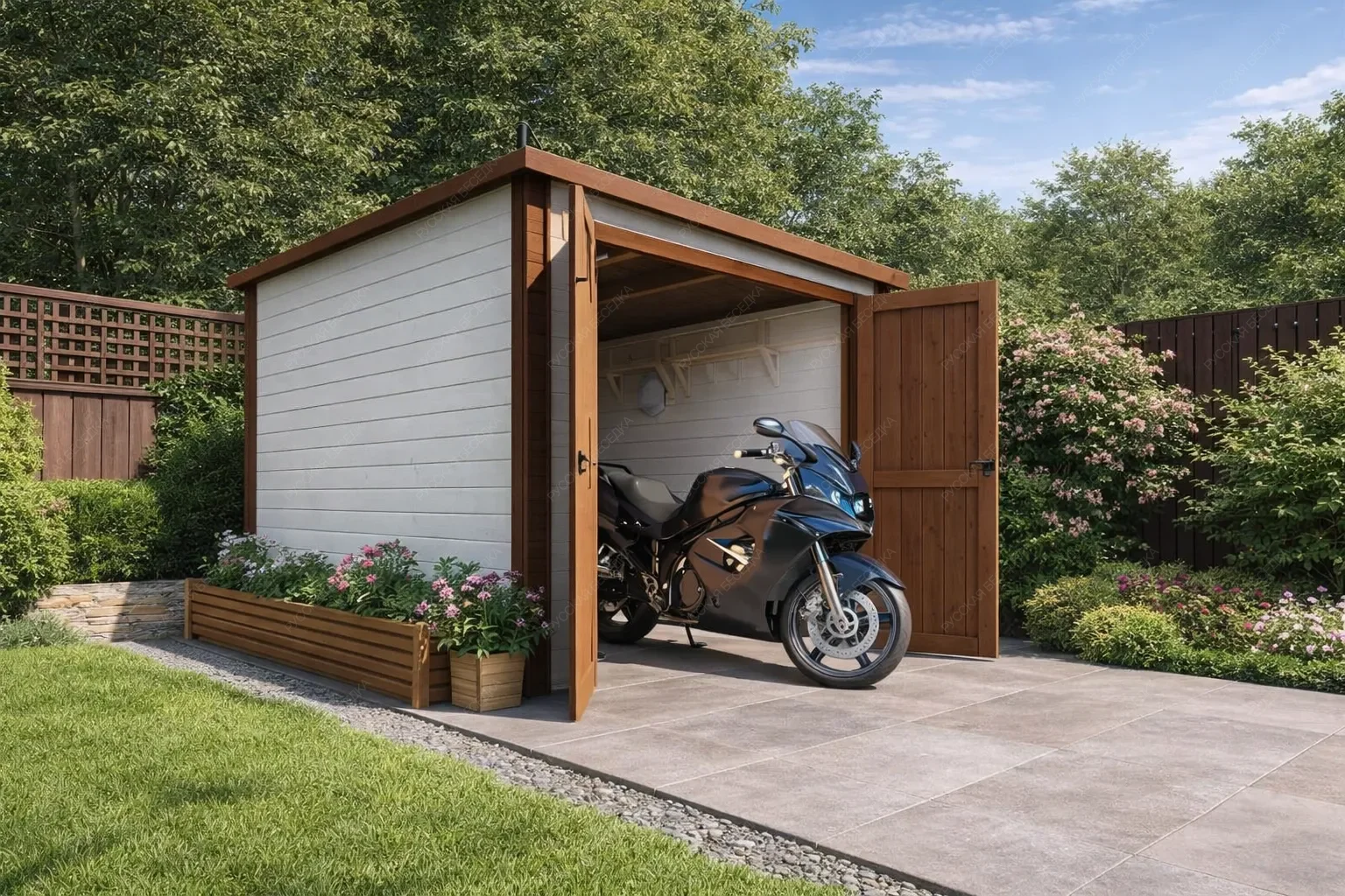 Деревянный гараж для мотоциклов и квадроциклов — это специализированное сооружение, созданное для надёжного хранения мототехники и сопутствующего оборудования. Прочная конструкция из натуральной древесины обеспечивает оптимальный микроклимат внутри: материал дышит, предотвращая скопление влаги и образование коррозии на металлических деталях, а также защищает от резких перепадов температур. Это идеальная среда для сохранения работоспособности двигателей, ходовой части и внешнего вида техники в межсезонье и во время длительного простоя. Внутреннее пространство организовано с учётом потребностей владельца: предусмотрены полки и стеллажи для размещения шлемов, защитной экипировки, инструментов, запасных частей и расходных материалов. Всё необходимое всегда под рукой, а порядок внутри гаража позволяет быстро подготовиться к выезду или провести техническое обслуживание. Продуманная система хранения исключает беспорядок и экономит время. Внешний вид строения гармонично вписывается в любой ландшафт, будь то загородный участок или территория загородного дома. Древесина придаёт естественность и экологичность, а при желании гараж может быть окрашен в любой цвет или покрыт защитными составами для увеличения срока службы. Конструкция рассчитана на высокие нагрузки, устойчива к ветру и осадкам, что гарантирует сохранность мотоциклов и квадроциклов даже в суровых погодных условиях. Инвестиция в такой гараж — это вложение в долговечность техники и собственное спокойствие.