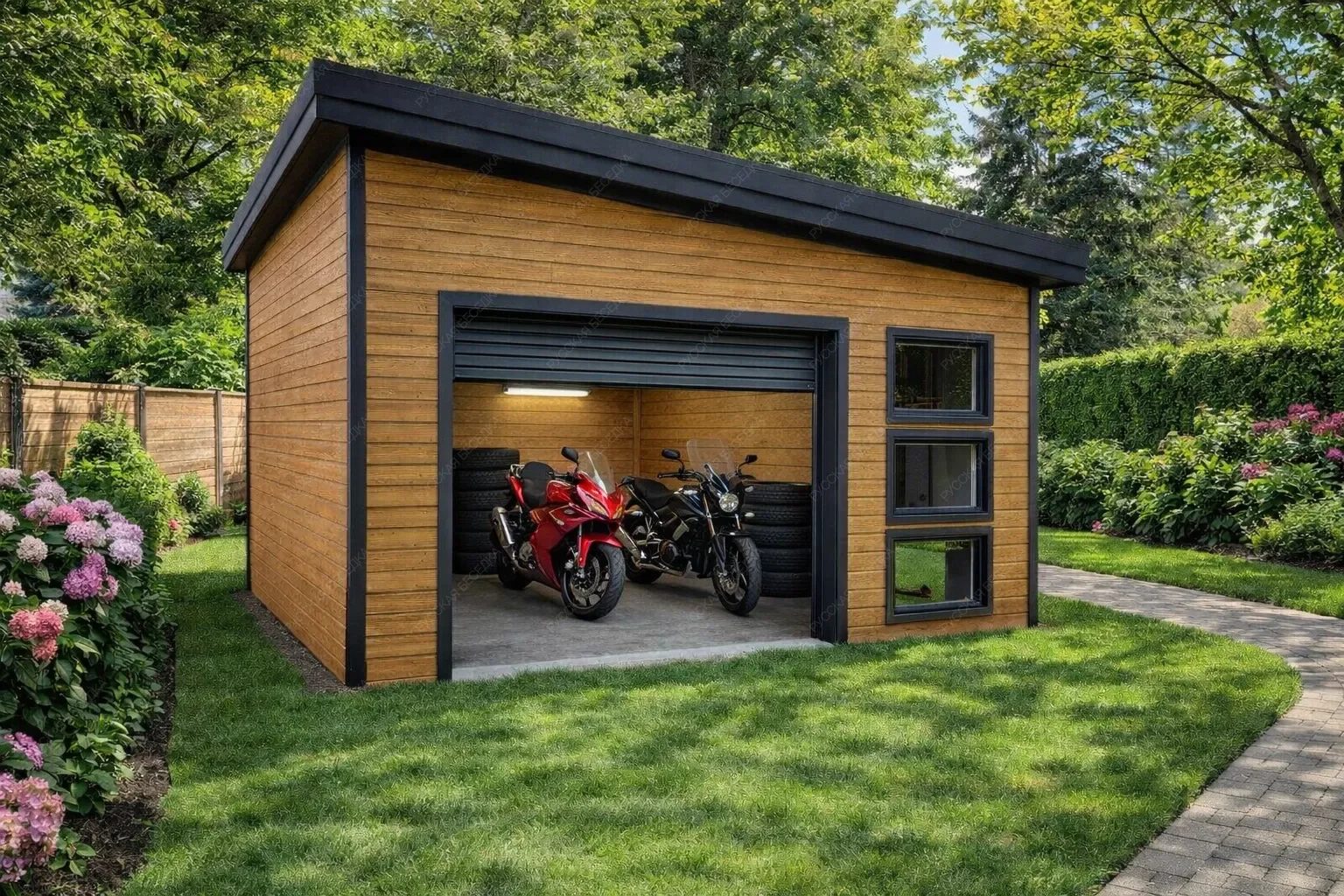 Деревянный гараж для мотоциклов и квадроциклов — это специализированное сооружение, созданное для надёжного хранения мототехники и сопутствующего оборудования. Прочная конструкция из натуральной древесины обеспечивает оптимальный микроклимат внутри: материал дышит, предотвращая скопление влаги и образование коррозии на металлических деталях, а также защищает от резких перепадов температур. Это идеальная среда для сохранения работоспособности двигателей, ходовой части и внешнего вида техники в межсезонье и во время длительного простоя. Внутреннее пространство организовано с учётом потребностей владельца: предусмотрены полки и стеллажи для размещения шлемов, защитной экипировки, инструментов, запасных частей и расходных материалов. Всё необходимое всегда под рукой, а порядок внутри гаража позволяет быстро подготовиться к выезду или провести техническое обслуживание. Продуманная система хранения исключает беспорядок и экономит время. Внешний вид строения гармонично вписывается в любой ландшафт, будь то загородный участок или территория загородного дома. Древесина придаёт естественность и экологичность, а при желании гараж может быть окрашен в любой цвет или покрыт защитными составами для увеличения срока службы. Конструкция рассчитана на высокие нагрузки, устойчива к ветру и осадкам, что гарантирует сохранность мотоциклов и квадроциклов даже в суровых погодных условиях. Инвестиция в такой гараж — это вложение в долговечность техники и собственное спокойствие.