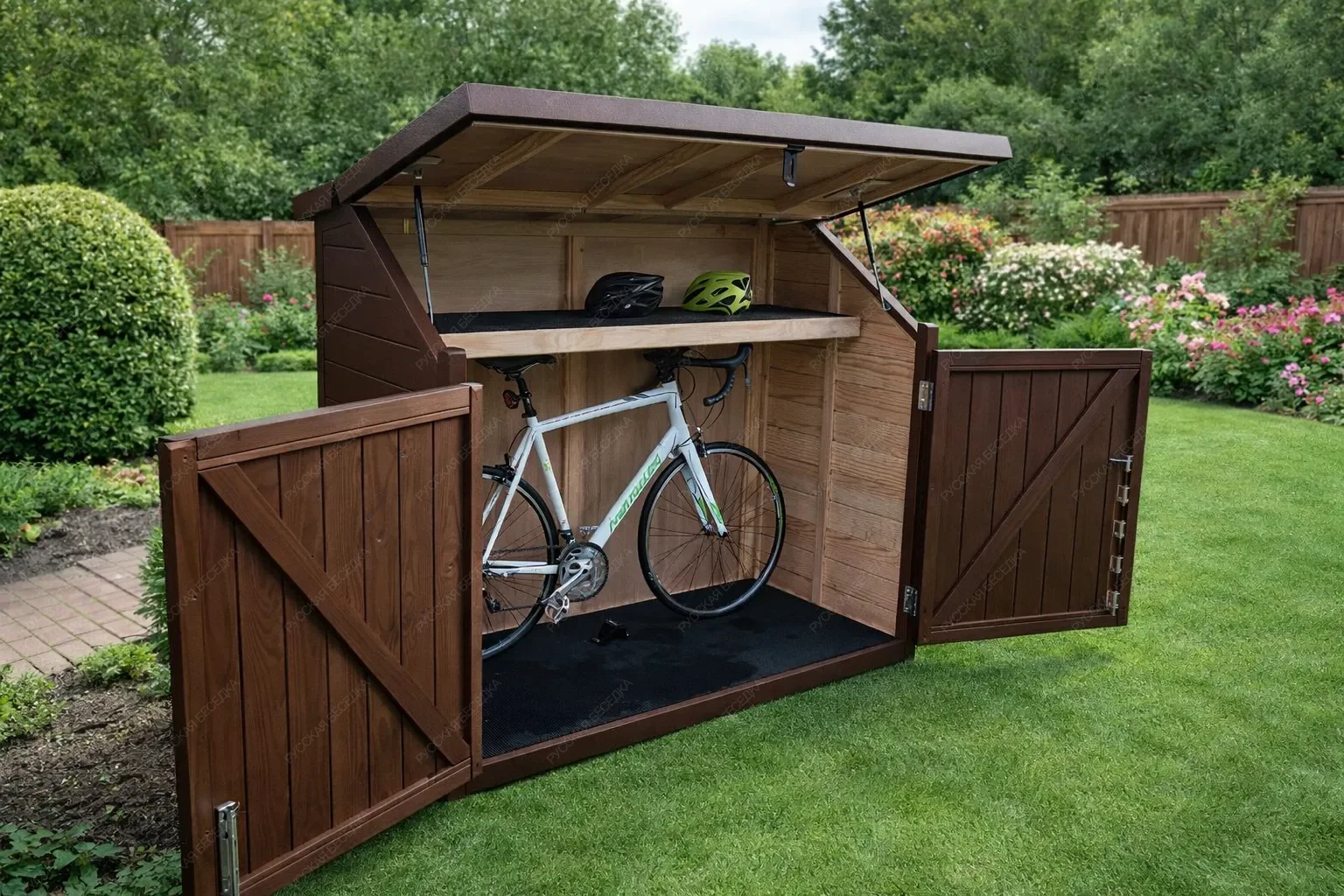 Деревянный гараж для велосипедов — это продуманное решение для хранения двухколёсной техники и сопутствующего инвентаря. Компактное строение из натурального дерева защищает велосипеды от дождя, снега, ультрафиолета и перепадов температур, продлевая срок службы узлов и сохраняя внешний вид рам. Внутреннее пространство организовано с учётом потребностей активных людей: предусмотрены удобные полки для шлемов, насосов, инструментов и смазочных материалов, а также крючки для подвешивания покрышек, велокомпьютеров или рюкзаков. Такая система хранения позволяет быстро найти нужную вещь и поддерживать порядок без лишних усилий. Изготовленный из качественной древесины, гараж гармонично вписывается в ландшафт загородного участка или городского двора, не нарушая эстетики окружающей среды. Дерево обеспечивает естественную вентиляцию, предотвращая образование конденсата, который вреден для металлических деталей. Конструкция рассчитана на длительную эксплуатацию и может быть выполнена в различных размерах, чтобы вместить от одного до нескольких велосипедов. Надёжные крепления и устойчивость к ветровым нагрузкам гарантируют сохранность имущества даже в сложных погодных условиях. Аккуратное размещение велосипедов освобождает полезную площадь гаража, сарая или балкона, делая повседневную жизнь более комфортной и организованной.