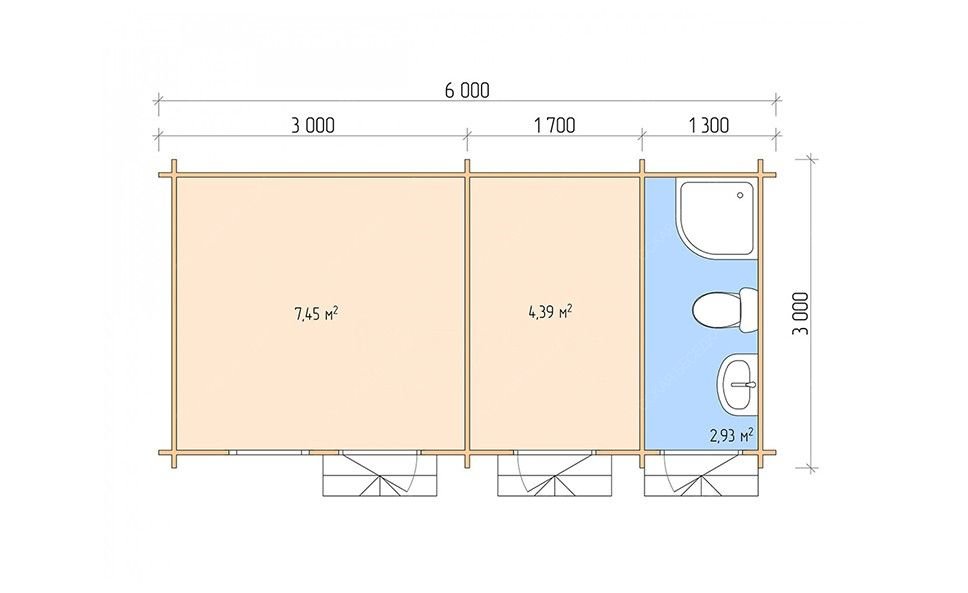 • Потолок: имитация бруса 20×135 мм, камерной сушки
