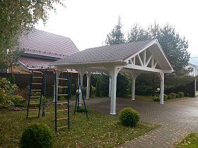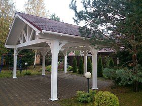 Участок возле собственного дома, дачи или любого другого частного домостроения не обходится без малых архитектурных форм. Удачным приобретением станет деревянный навес для автомобиля. Навес может быть полностью автономной конструкцией с классическими архитектурными формами или же, выполненный в виде пристройки к дому. Конструкция изящно впишется в планировку любого дачного участка.