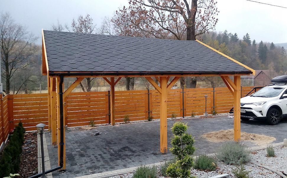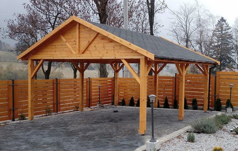 Навес из дерева послужит отличным парковочным местом для одного или нескольких автомобилей.