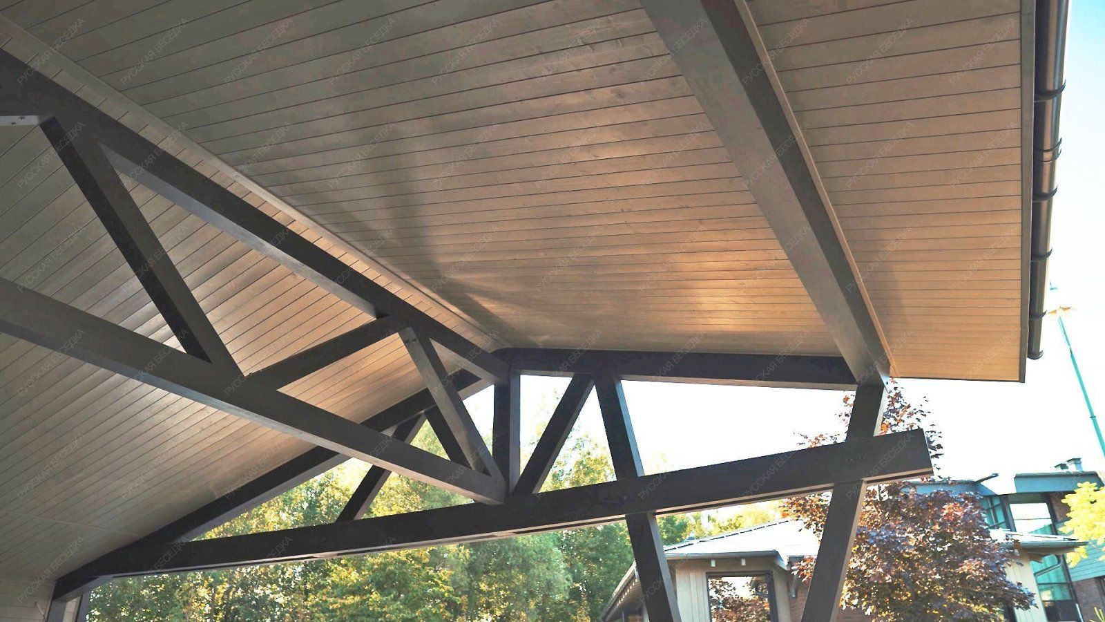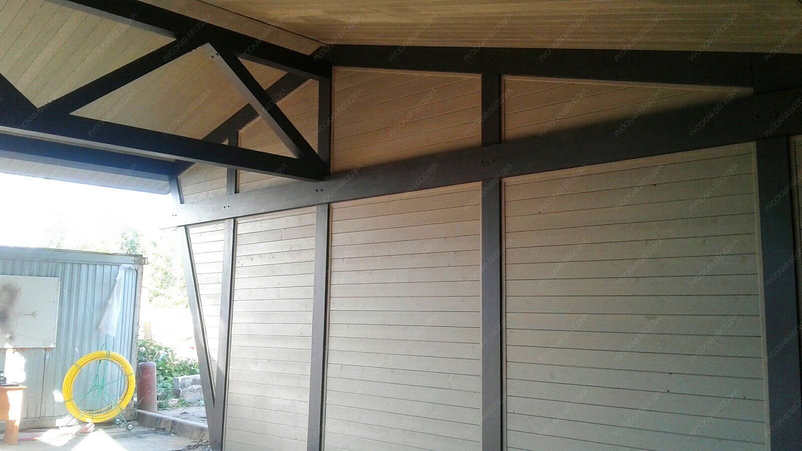 Для производства всех элементов навеса используется только отборная древесина без малейших дефектов, прошедшая камерную сушку и пропитку антисептиками. Навесу после защитной обработки лаком не страшны высокая влажность, а значит, можно быть уверенным, что дерево не растрескается, не разбухнет и не покоробится.
