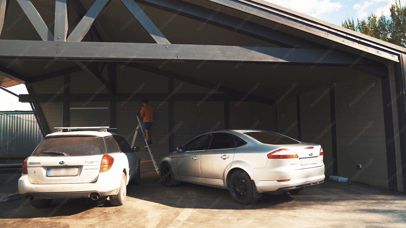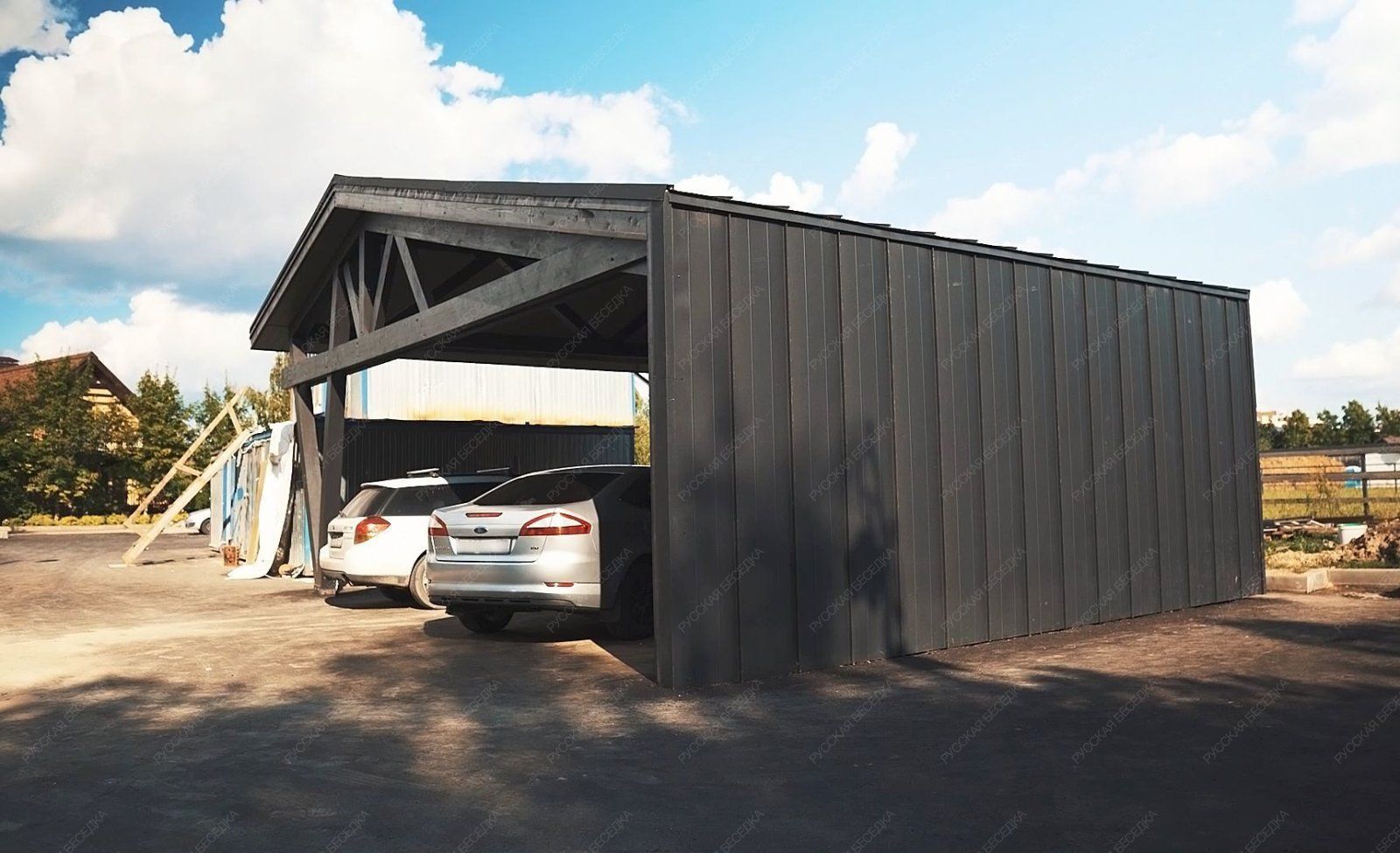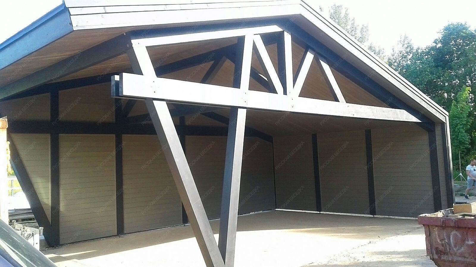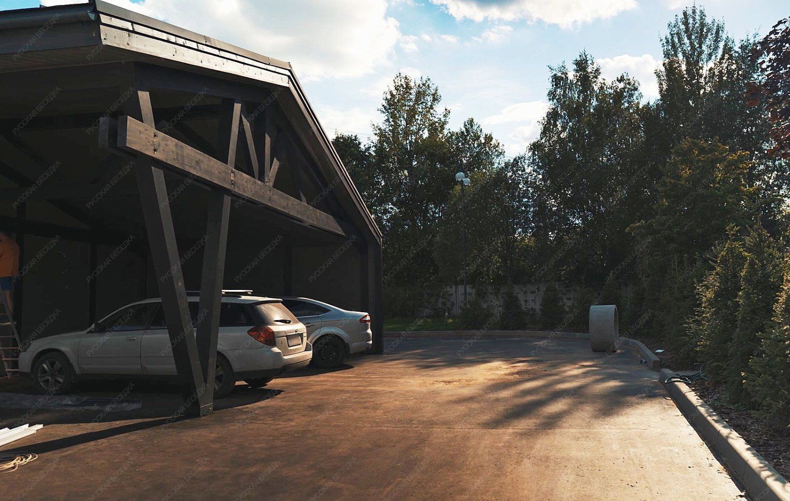 Навес из дерева послужит отличным парковочным местом для одного или нескольких автомобилей.
