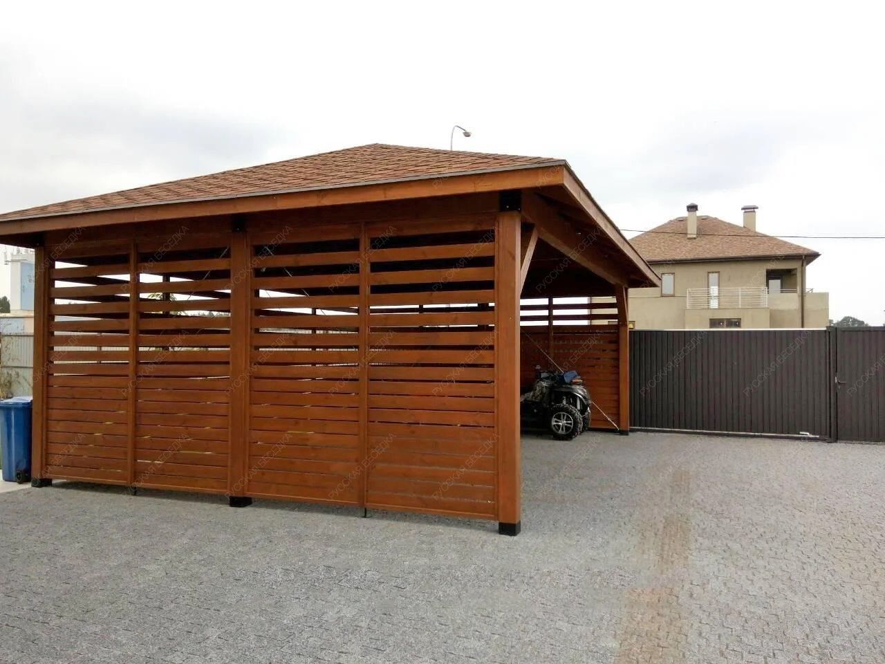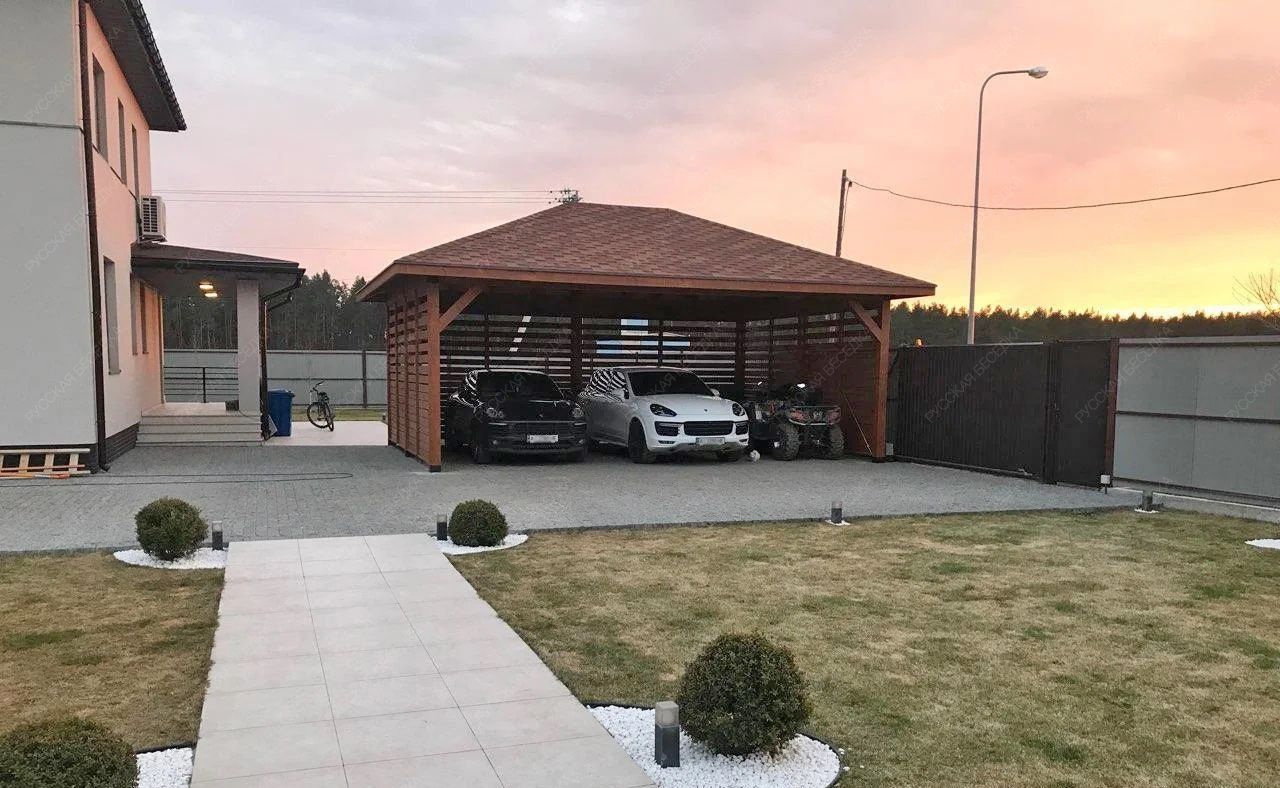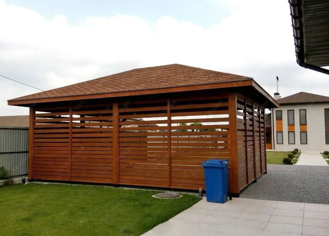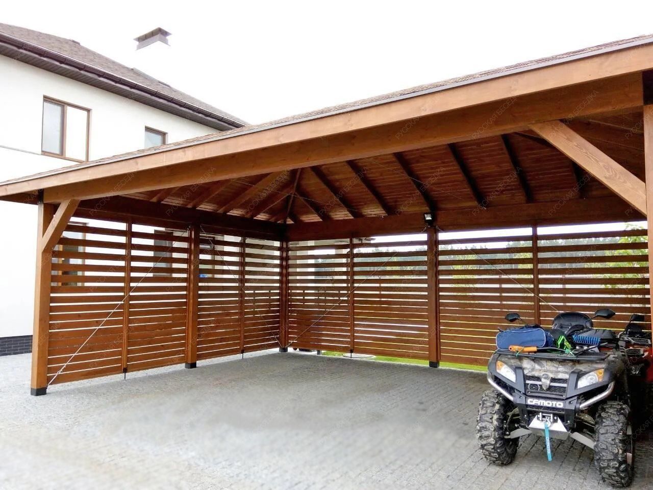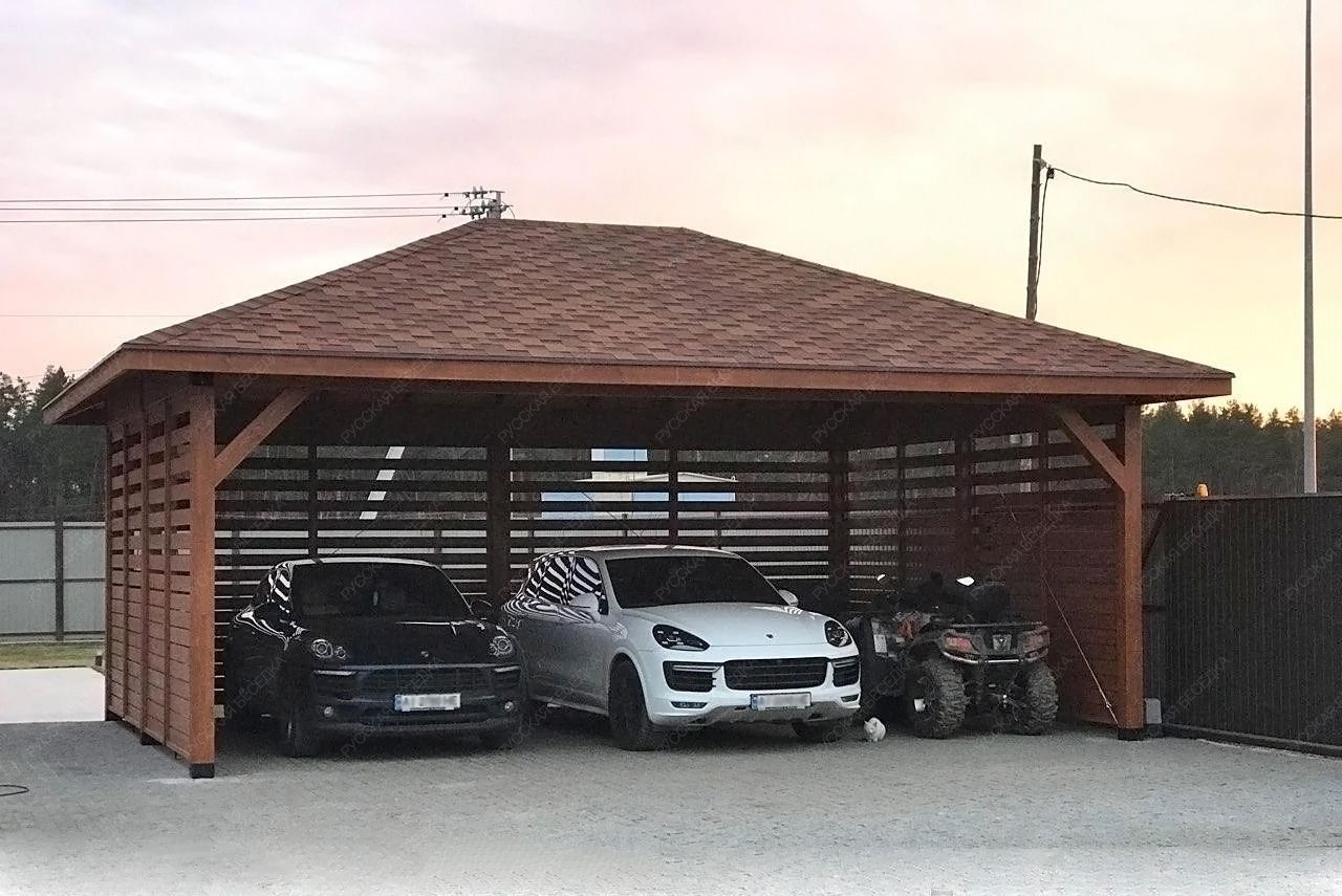 Навес из дерева послужит отличным парковочным местом для одного или нескольких автомобилей.