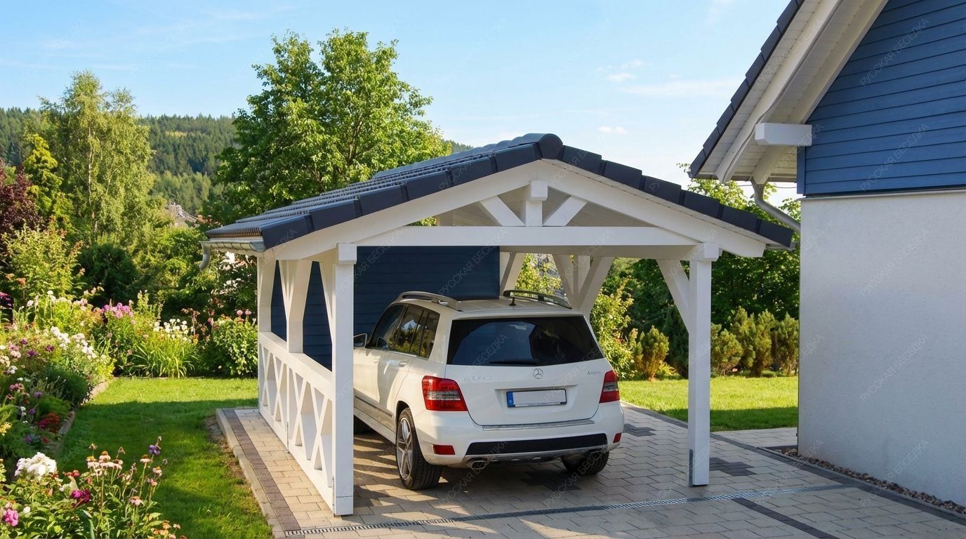 Навес из дерева послужит отличным парковочным местом для одного или нескольких автомобилей.