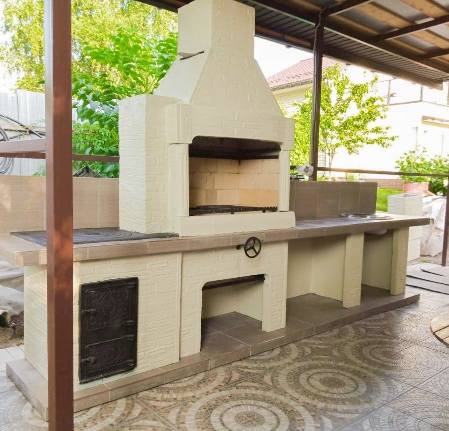 - Простые, но качественные материалы. Для создания каркаса печи-барбекю на дачу мы используем армированный бетон, огнеупорный кирпич. Облицовка конструкции делается с помощью прочной плитки. Для окрашивания выбрана устойчивая порошковая краска.