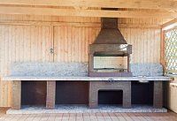 - Нейтральный и очень симпатичный дизайн. Уличный комплекс барбекю впишется в любой ландшафт. Поскольку изделие с дымоходом, его устанавливают и в помещения. Подходят крытые беседки, летние кухни. Средний вариант — это навес: с крышей, но без стен.