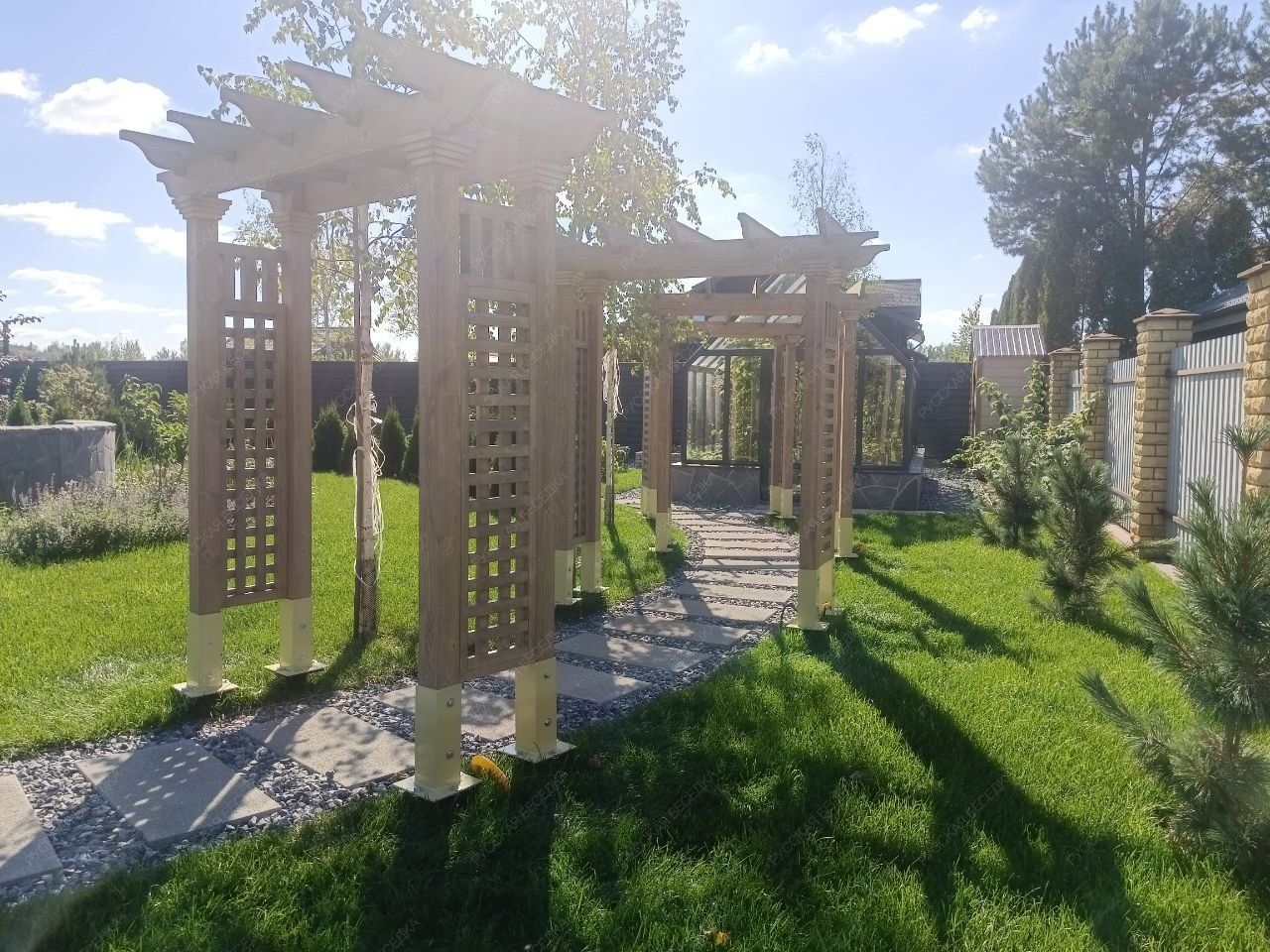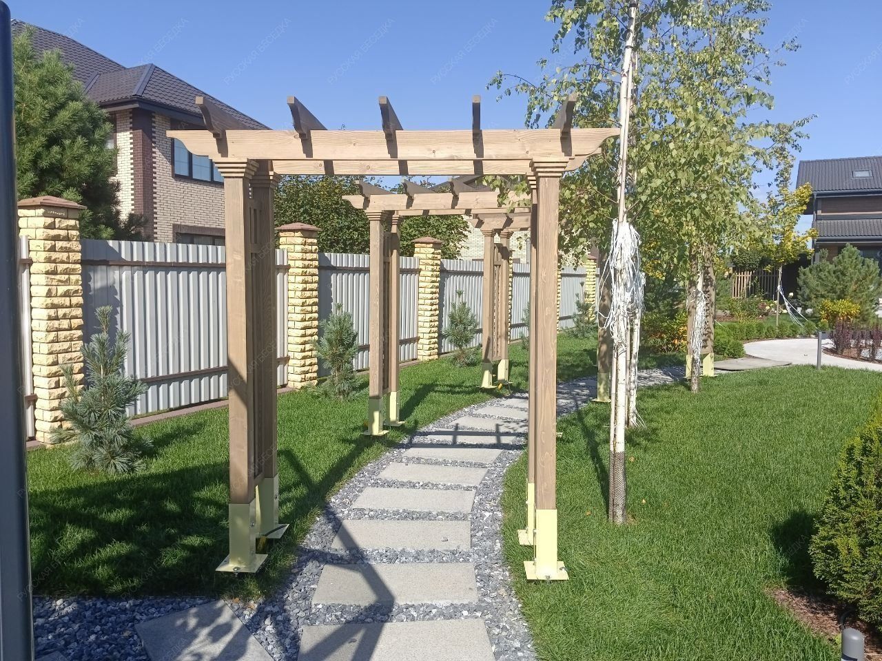 Деревянная пергола придаст вашему садовому участку теплую и уютную атмосферу.Также пергола может служить опорой для плетущихся растений - только представьте, как приятно находиться в окружении цветущего клематиса или пышных роз! Дополнительные элементы, такие как встроенное освещение, декоративные решетки, качели или скамейки, могут усилить визуальный эффект и создать еще более комфортное пространство. А если в конструкцию перголы добавить подиум, то он может служить местом для расслабления или стать сценой для семейных мероприятий.