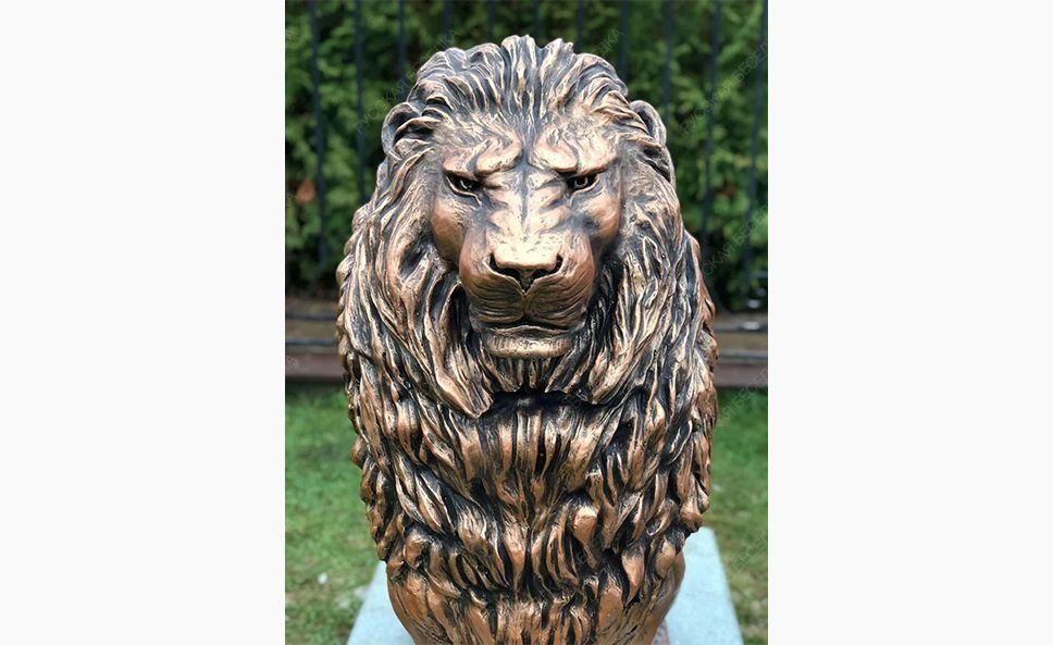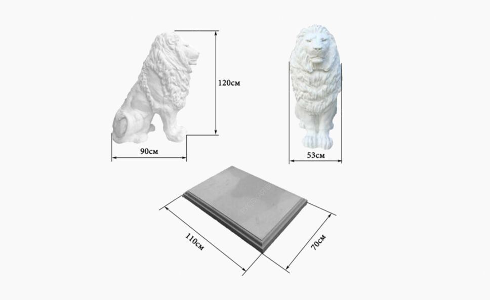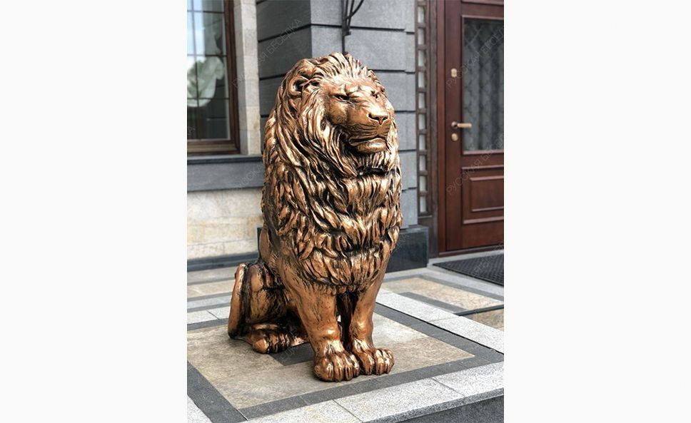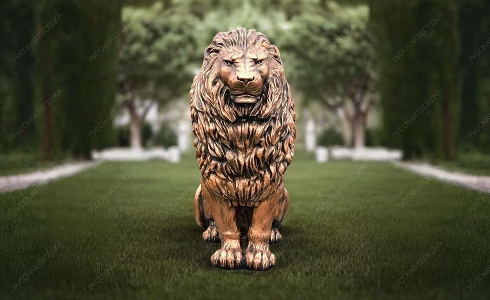 Скульптура выполнена из архитектурного бетона по технологии вибролитья. Изделие после отливки шпаклюется и красится фасадной краской со сроком службы до 20 лет. Доступны любые варианты покраски – золото, бронза, античная бронза, черный, белый и т.д. Лапы армируются. Стоимость и размеры указаны для самой скульптуры. Подставка предлагается отдельно.                 Скульптура имеет внушительные размеры, благодаря которым она отлично вписывается в экстерьер больших домов, с широкими лестницами и роскошными входными группами. Вес скульптуры (500 кг) позволяет устанавливать её на любую ровную поверхность без необходимости дополнительного крепежа. Нижняя часть плоская и широкая. Передние лапы соединены и представляют собой одну мощную точку опоры. Льва невозможно сдвинуть, столкнуть, уронить без спец. техники. Даже самые активные гости в разгар самого бурного веселья не в силах потревожить этого зверя.                                                                                                     Садовая скульптура льва – это один из наиболее давних приёмов украшения домов, усадеб, садов и гостиниц. Лев всегда ассоциируется с властью, силой, благородством и храбростью. Даже на Спасской башне по сторонам циферблата сидят каменные скульптуры львов. Наибольшую популярность садовые скульптуры львов приобрели в эпоху Классицизма. Ими украшали входные группы, пилоны ворот, стены и двери.