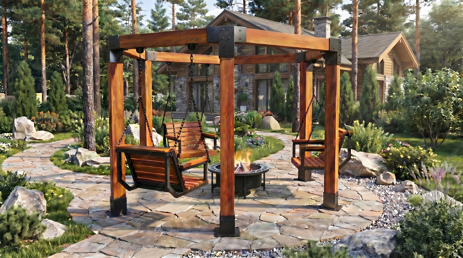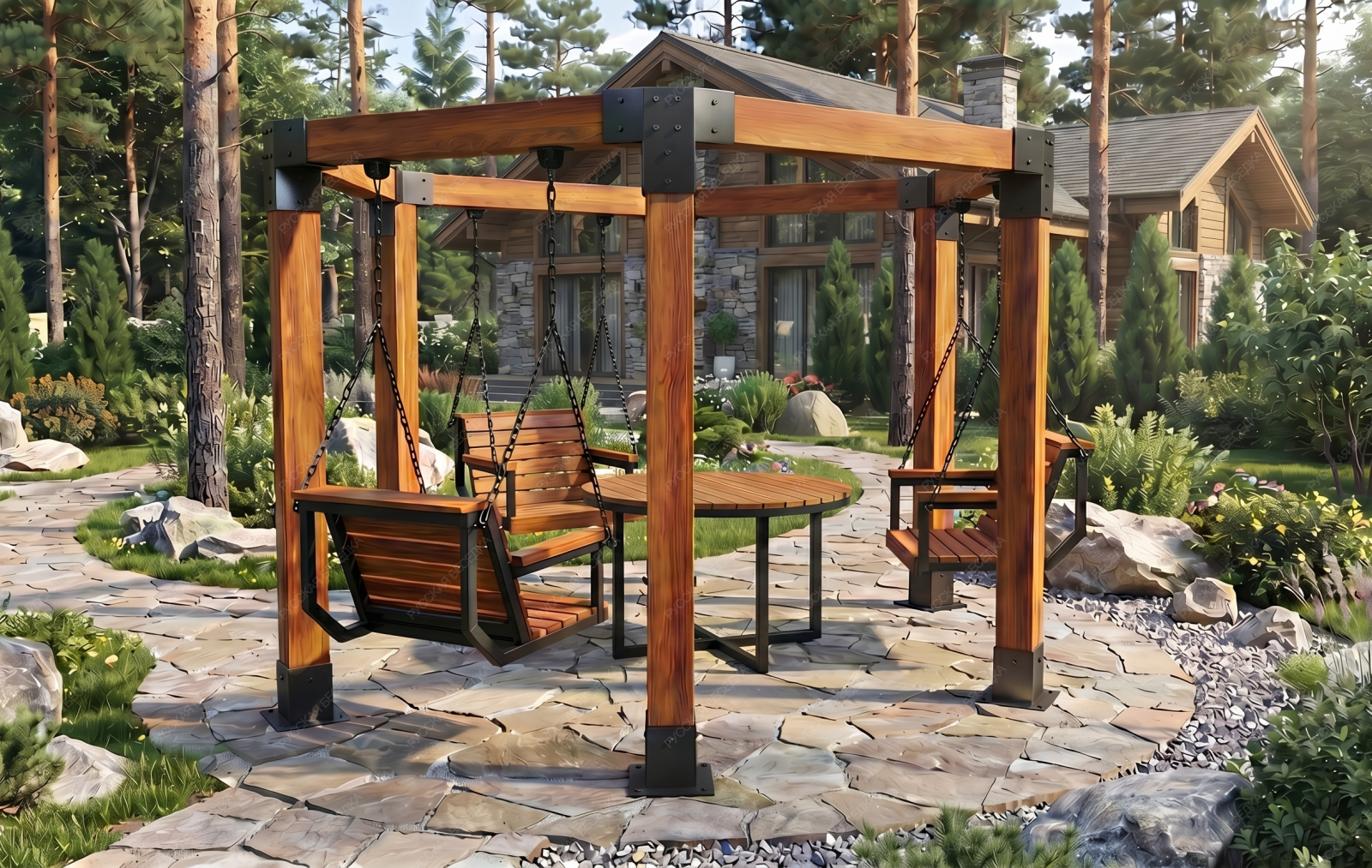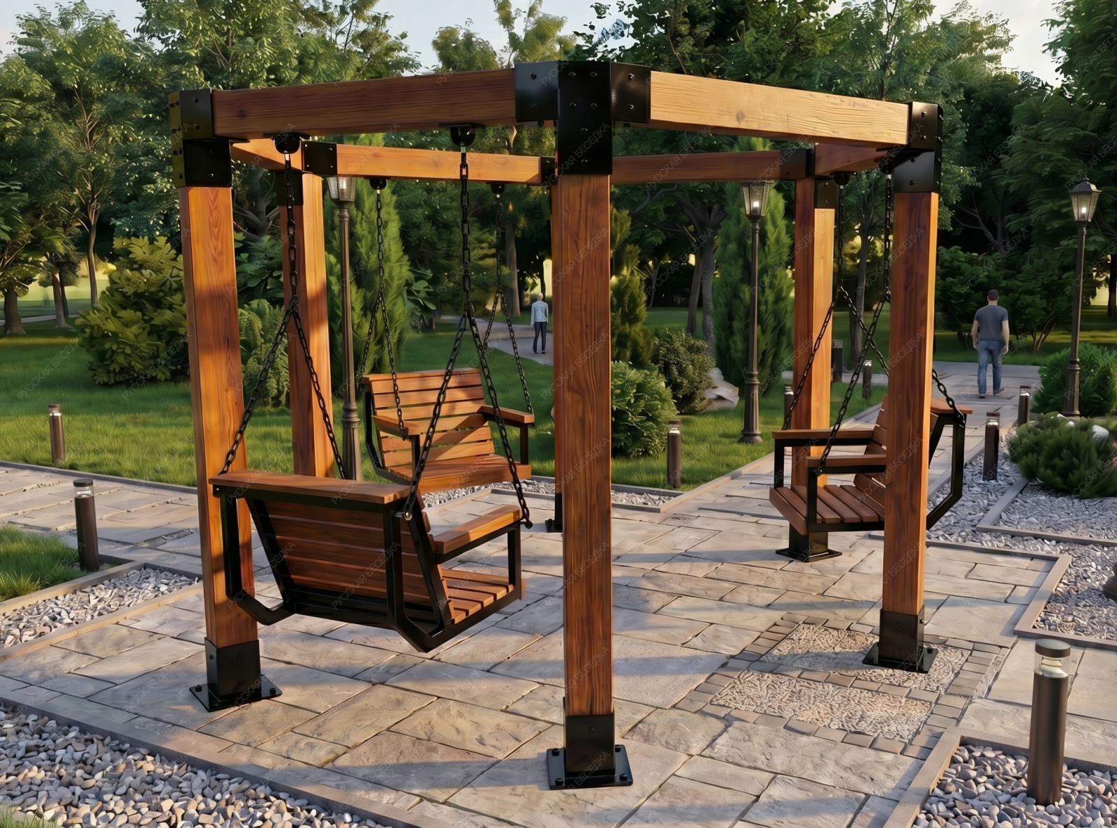 Эти качели идеально вписываются в ландшафт вашего участка, добавляя ему стильный и современный акцент. Они станут любимым местом для всей семьи, где можно провести время в общении и отдыхе.