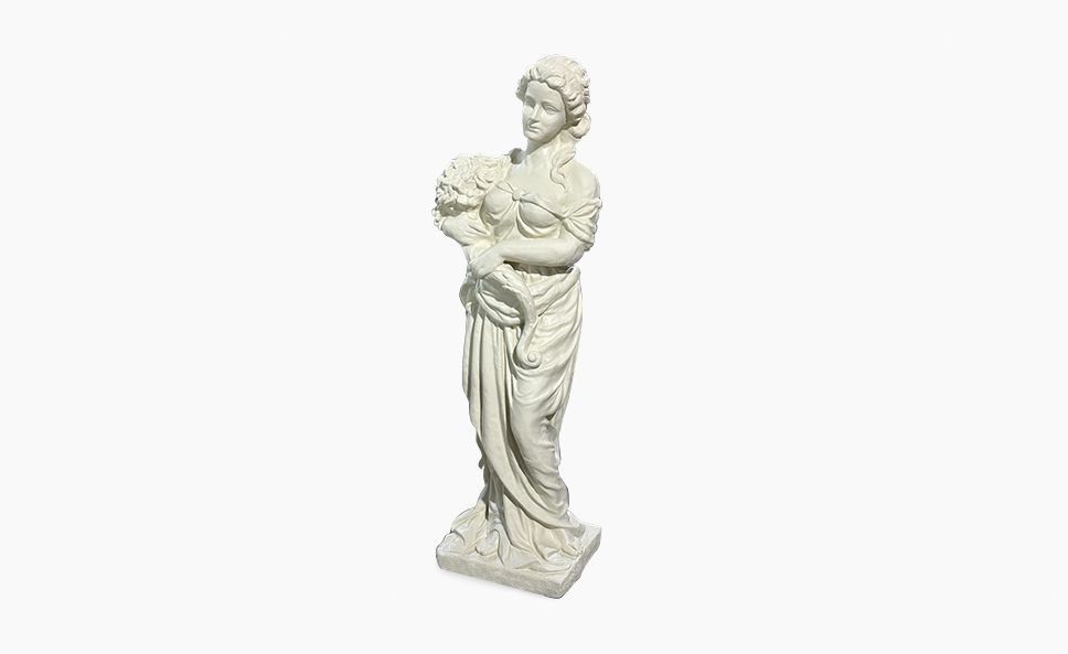 Статуя девушки из бетона с букетом цветов в платье. Классическая античная скульптура для украшения помещений, парков и дворов. Материал скульптуры – архитектурный бетон. Изделие может легко функционировать и в жару, и в холод, поэтому его допускается использовать на улице круглогодично. Само изделие может быть покрашено в любой цвет на выбор: золото, бронза, античная бронза и др.                                                                                                                               Скульптура девушки с букетом имеет средний размер, который отвечает максимально широкому спектру запросов. Именно такие статуи украшают большую часть дворцов, именитых дворов и садов. Скульптура девушки из архитектурного бетона является классическим украшением садовых территорий и придомовых участков. Её можно устанавливать как в помещении, так и на открытом воздухе. Архитектурный бетон, изготовленный по особенной рецептуре, прекрасно переносит воздействие влаги и российских морозов. Такая скульптура может использоваться как обособленное изделие, так и на тумбе. Все наши изделия выполнены из прочных и качественных материалов, поэтому любые погодные условия им не страшны. Мы рекомендуем накрывать изделия на зимний период специальным чехлом (тентом) – это не только облегчит чистку изделия весной, но и продлит срок службы защитного покрытия.