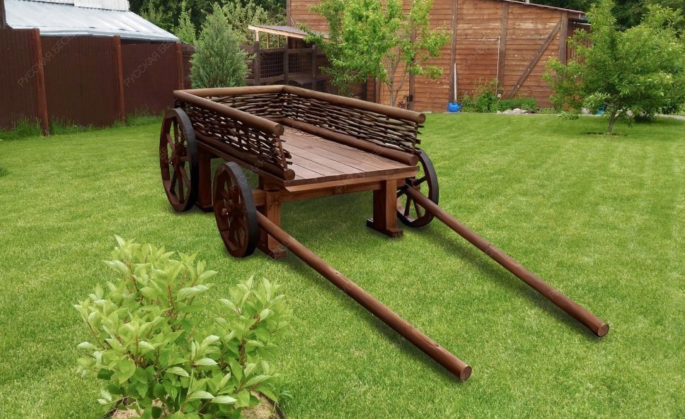 Украшать сад тележкой деревянной – модная современная тенденция. Ее можно использовать в качестве цветника или декоративной подставкой для красивых элементов. Садовый дизайн предполагает использование различных аксессуаров, и именно деревянная тележка с плетеными бортами и длинными подводами способна заполнить собой частичку территории наиболее эффективно. Борта телеги невысоки, а значит, любая декоративная штучка или горшочек с цветком останется на виду. Колеса достаточно массивны и функциональны, поэтому деревянная тележка садовая может спокойно перевозиться с места на место. Телега деревянная может быть окрашена в любой предпочитаемый цвет, который в то же время защитит от всех вредных воздействий окружающей среды.
