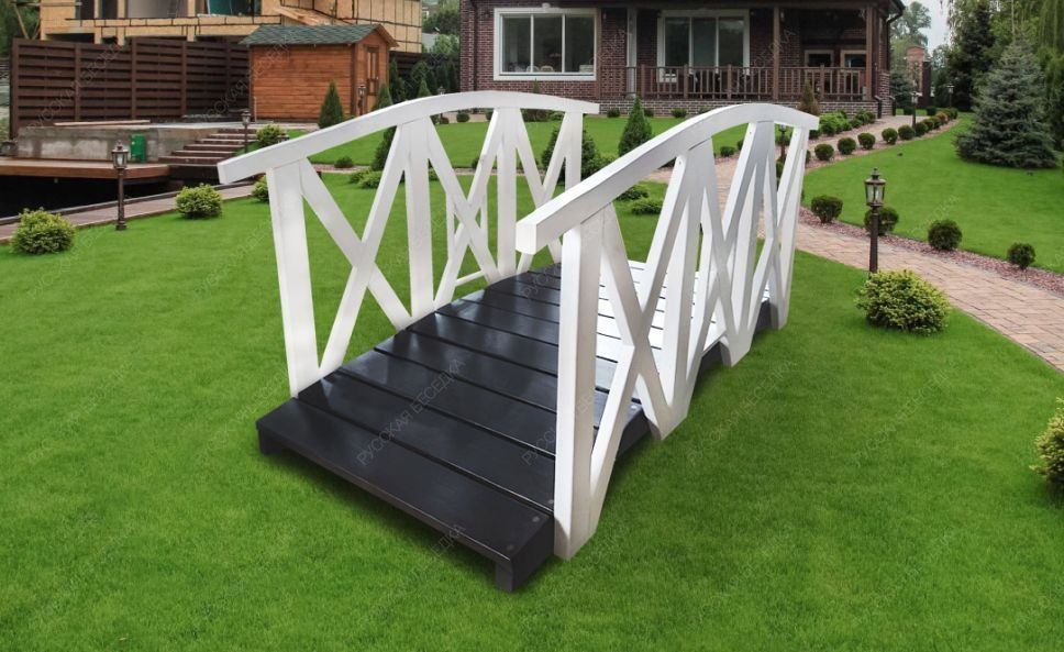Деревянный мост строгого дизайна подходит для большинства стилей ландшафтного дизайна. Окрашенный в цвета согласно общей цветовой гамме дома и декоративных элементов он станет гармоничной частью рукотворной композиции, придавая участку оттенок романтики и изящности. Помимо того, что мостик для декора сада является красивым изделием, он наделен и практической функцией - по нему можно ходить, останавливаясь, чтобы полюбоваться на шикарные виды собственного цветника.