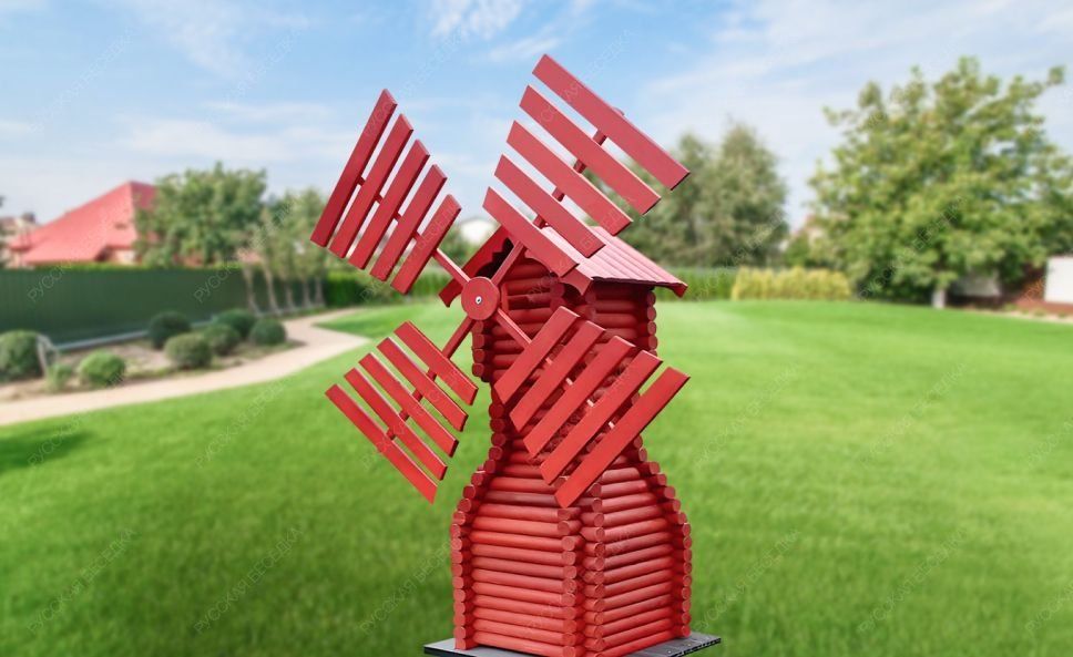 Большая деревянная мельница для украшения домов отдыха, загородных отелей, частных домов. Ее внушительные габариты и красивый внешний вид становятся причиной пристального внимания людей к этому изделию. Мельница выполнена из березовых бревнышек небольшого диаметра в стиле настоящей русской деревни. На Руси мельница выполняла рабочую функцию по помолу муки, сейчас же ее функция чисто декоративная: украшать сад, маскировать неприглядные участки, быть частью продуманной композиции.