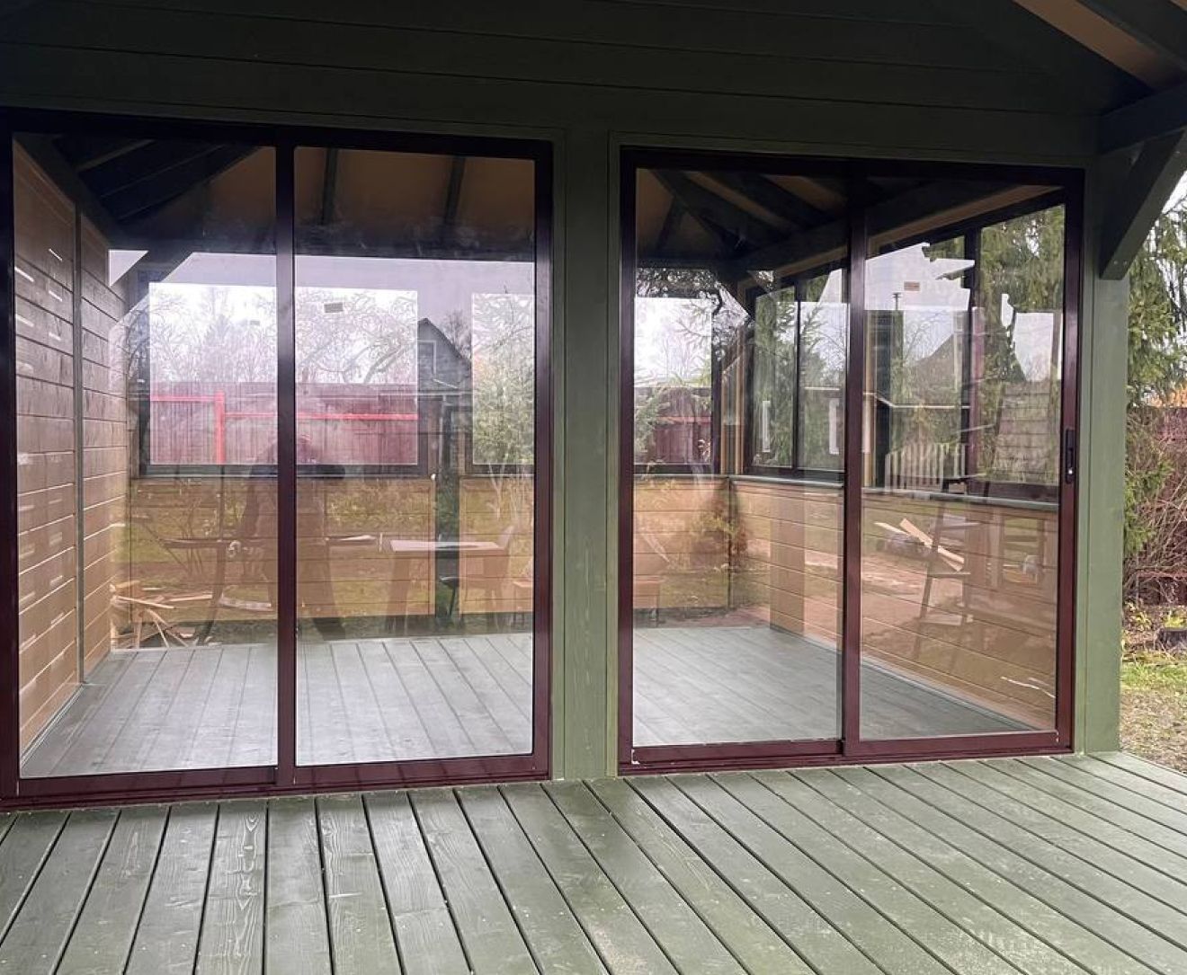 Раздвижная алюминиевая система. Окна в бронировочной пленке. Цвет пластика белый или коричневый.